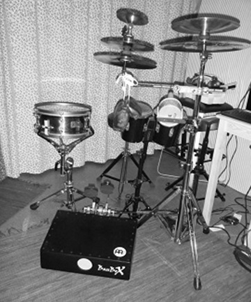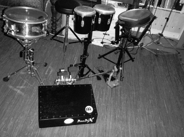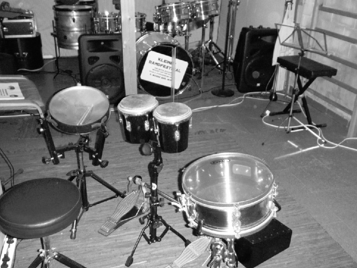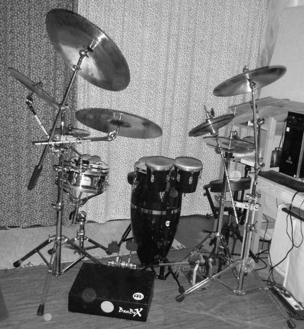 Bambulete am Anfang (2010-12), dann hauptsaechlich virtuelle Perkussionsgruppe (von links nach rechts): Standard-Schlagzeug & Mhdb-Schlagzeug